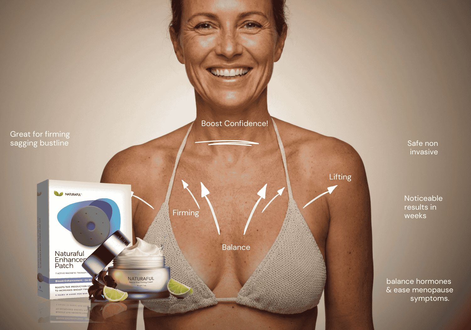 Naturaful Bust Firming Cream and Patches work together to support natural fullness and firmness in the chest area. The advanced formula helps promote a smoother, more lifted appearance, contributing to a youthful silhouette. With consistent use, the skin feels more supported and refreshed, enhancing your natural contours.